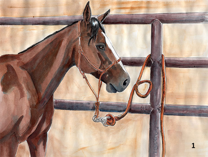 Lay the lead rope across your left hand with the free end hanging down. Form a small loop in the line in your hand by taking the free end of the rope over, not under, the line in your hand. Then pass the free end of the rope behind the pole, or whatever you’re tying your horse to.