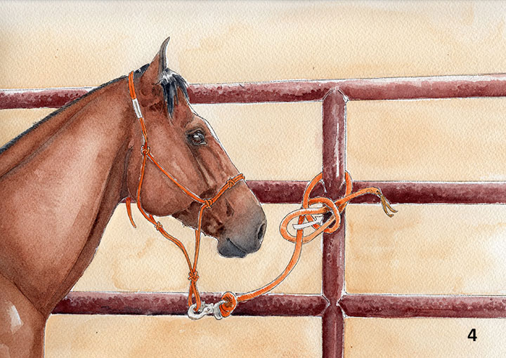 Tighten the knot by pulling on the free end while holding the line attached to the horse.