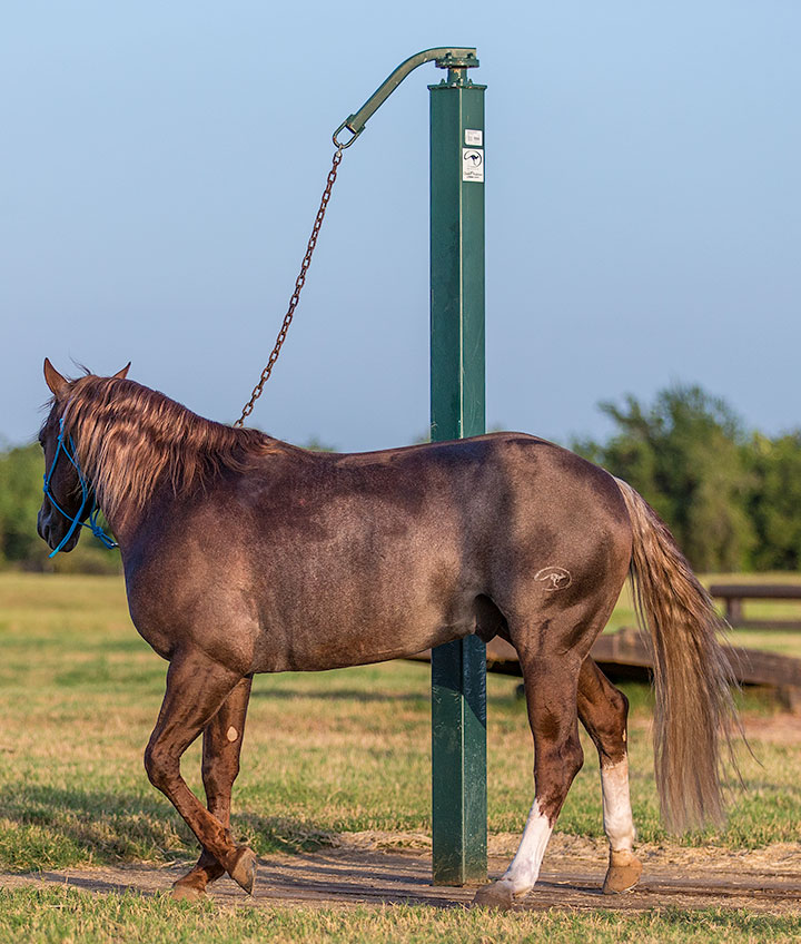 My preferred method of tying a horse up around the ranch is to use a Patience Pole. My version of a Patience Pole is a 12-foot steel pole set in concrete 4 feet deep in the ground with 8 feet rising up perpendicular to the ground. At the top is a hub, and welded to that is a solid 3/4-inch tube that extends down about a foot and has a loop at the end for attaching the horse’s lead rope or a heavy-duty chain. The idea behind a Patience Pole is that if the horse walks around the pole, the hub spins around. So if a horse gets nervous and wants to move, he is more than welcome to move his feet, but instead of walking off, he just goes around in circles. After a while, the horse gets kind of tired and eventually defeats himself mentally—he realizes that no matter how much he moves, he’s never ever going to go anywhere, so he might as well stand still and relax.