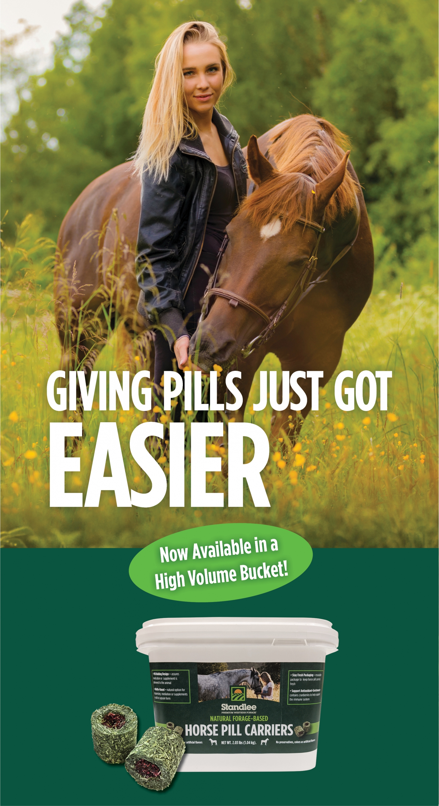 March 19, 2020 Giving pills to your horse just got easier A pill holding design made with natural flavors horses prefer. • Dependable way to give medication • Hand-crafted alfalfa treat • Wholesome cranberries and natural flavors • No Preservatives, No Artificial Colors or Flavors Learn More Use Standlee Forage Finder® to find forage for your horse’s specific needs. Use our Feed Calculator to find out how much you should feed your horse. Use the Store Locator to find Standlee products at stores near you.