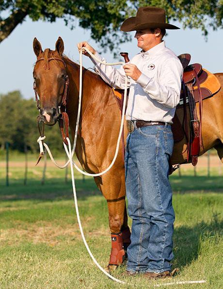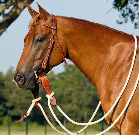 For either option, the slack in the rope should hang down slightly lower than the loop rein, hanging 2 to 3 inches below it. Reason being that you don’t want the lead to hinder the horse’s head if you are flexing to the right when mounted. If the lead is too short, your horse can’t flex far enough because he’ll run into pressure.