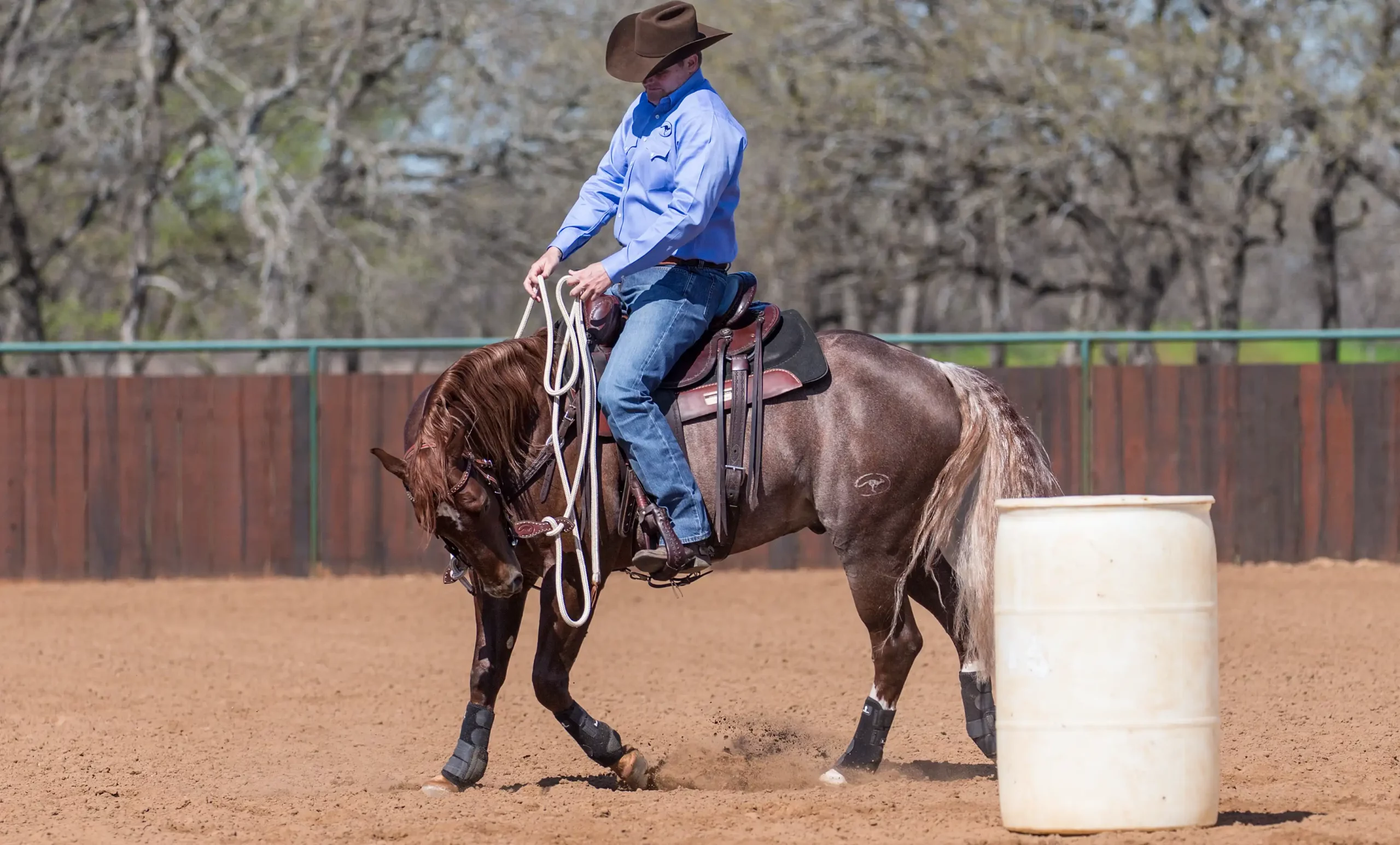 Since the horse is already shaped correctly for the rollback, meaning that his nose is tipped in the direction you’ll ask him to turn in, all you have to do is change the position of your legs to cue him to roll back.