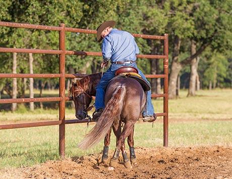 After warming the horse up, I hustle his feet at the rollback fence for five to 10 minutes. The more busy-minded the horse is, the longer I work him at the fence.