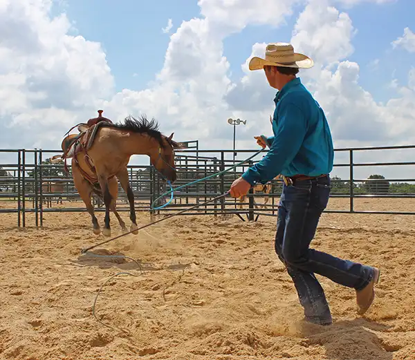 The second time I saddle a horse, and any time after that, he isn’t allowed to buck. If he starts to hump up with the saddle, I immediately redirect his feet and get him moving forward. If you allow a horse to buck every time you saddle him, it’ll quickly become an ingrained habit that’s difficult to break. So the first one’s on me, but after that, bucking is not allowed.