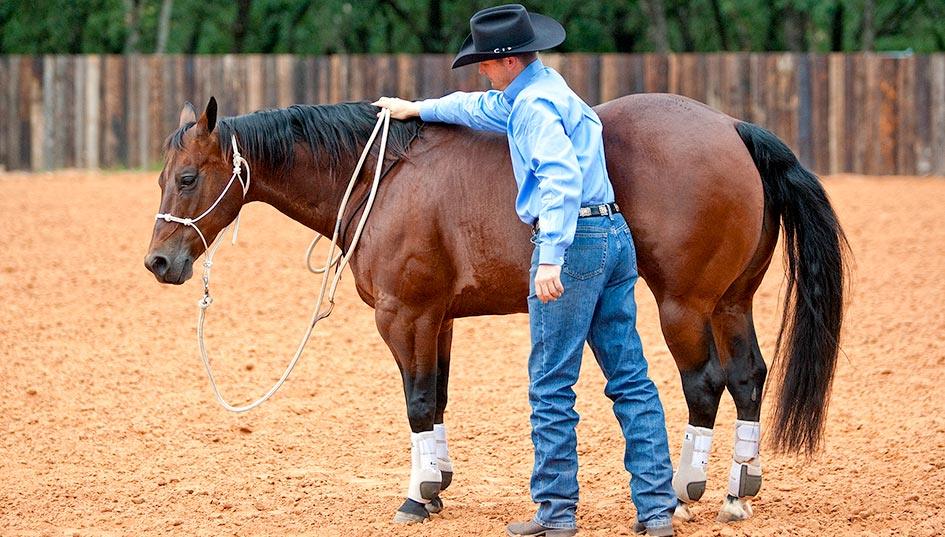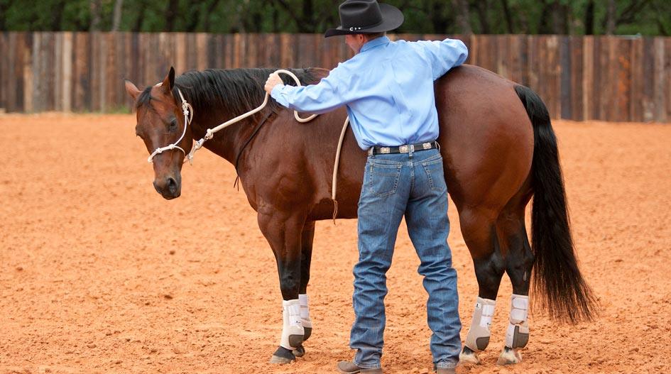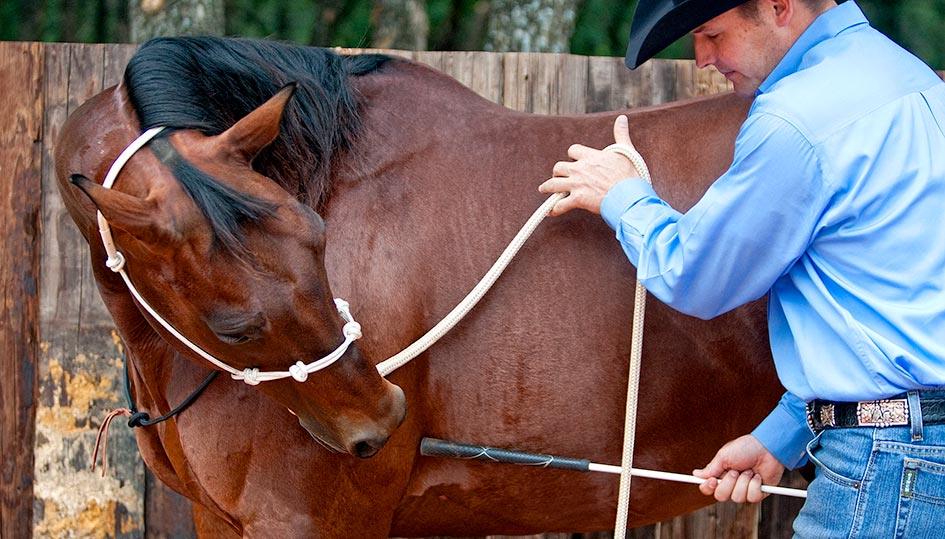 Flexing Stage Two works on 80 percent of horses, but for older, stiffer horses, this third technique will really get the horse light and responsive to the halter. Some horses are especially dull to the halter pressure, where you could bump on them all day long and they’ll just continue to lean against it. So by moving the driving pressure to their belly, they aren’t able to lean against it as much. Remember something, horses don’t have hard mouths, they have hard, stiff bodies. Any resistance you feel in the horse’s head or mouth is coming from his body. If you get the body soft and supple, the head and mouth will feel light. That’s why in this exercise you’ll use driving pressure on the horse’s ribcage to teach him to bend. It’s still the same concept as using driving pressure with the halter: Ask with steady pressure, then tell with driving pressure. The only difference is where the driving pressure is applied.