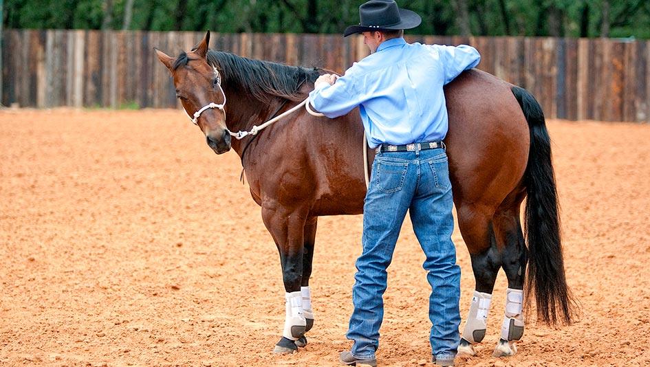 When you ask the horse to flex, stand even with his flank, glue your belly button to him and hug his hindquarters. If you’re standing on the left side of the horse, hug his hindquarters with your right arm. Standing in this position will give the horse an open area to touch his belly and it’ll keep you safe. When most horses are learning the exercise, they’ll move their feet and usually step back with their inside foot. If you’re too far forward the horse could step on you.