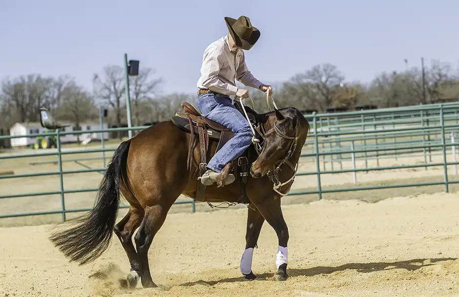 If his head is straight, he could take off, buck or rear. If the horse races around, keep the spur in place until he relaxes and slows down and does the exercise correctly. Then take the spur away. Remember, whenever you release the pressure, that behavior is what you’re rewarding.