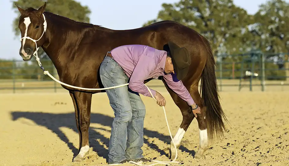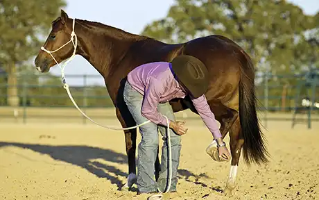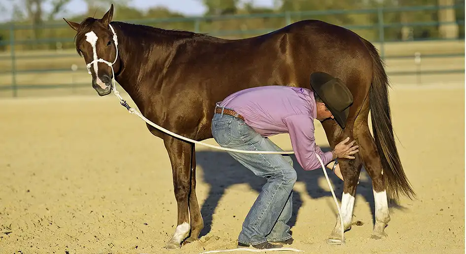 Now of course, throughout this process, Blue did struggle some. After all, he had a longstanding habit of kicking. Anytime he got defensive about me touching his legs and kicked out, I immediately dropped his foot and put his feet to work. I yielded his hindquarters really fast, backed him up aggressively and made him really hustle for a few minutes. Then I brought him to a stop and went straight back to picking his foot up. I wanted him to realize that he had two options: Option A—stand still and relax while I handle your foot, or Option B—work hard and sweat. Since horses are basically lazy creatures— they’d rather stand still and relax than have to work hard—they’ll pick the option with the least amount of work involved. So it didn’t take Blue long to realize that as long as he stood still and relaxed while I handled his legs, life was good. But when he kicked out and threw a fit, he had to hustle his feet and work hard. I made the right thing easy and the wrong thing difficult.