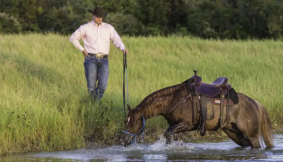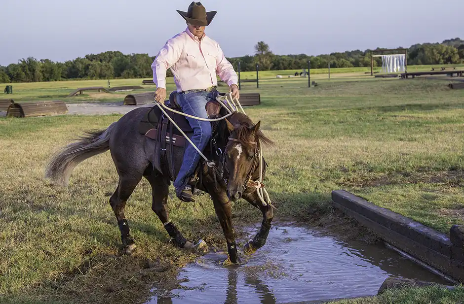 The key to teaching your horse to navigate any obstacle, including water, is to give him enough practice so that he gains confidence. Go over a stream or through a pond a hundred times. Go over it again and again, from different angles, at different speeds, and from all sides. At the ranch, we end every horse’s training session by putting him on a big, loose rein and letting him walk in the shallow perimeter of one of the ponds on the property. At that point in the ride, the horse is sweaty and he’s a little tired. Splashing through water doesn’t sound like a bad deal to him. If the horse wants to stop and drink water, we let him. If he wants to stop and stand for a few minutes, we let him. We rub on him and don’t make him feel wrong for relaxing. We make the pond seem like the best part of the ride for the horse, and it doesn’t take long for him to look forward to getting his feet wet.