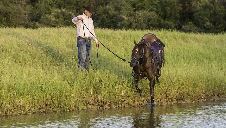 Like with every other obstacle, it’s best to introduce water crossings to your horse from the ground and to start with a low-key version of the obstacle so as not to overwhelm your horse. Then, as your horse’s confidence grows, you’ll move from the ground to the saddle, and increase the size and depth of the body of water you ask him to cross.