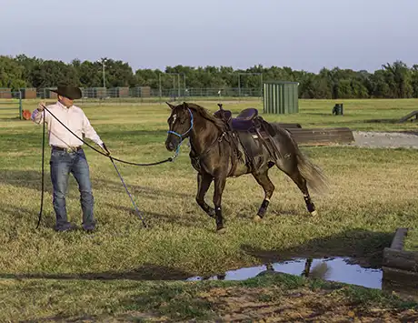 Using the Sending Exercise, send the horse back and forth in front of the puddle. As his confidence grows, he’ll gradually get closer to the water.