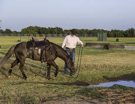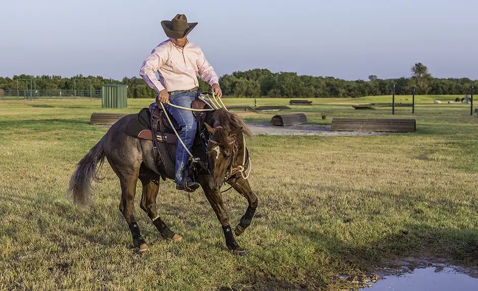 A rollback is a physically demanding maneuver for a horse to do when he does it correctly. Eventually, as you circle the puddle and roll back into it, the horse will get lazier and stop putting in as much effort, which will cause him to get closer and closer to the puddle until one of his hooves steps in the water. Every time he steps in the water and doesn’t get killed, he realizes that he can be a little more confident. The next time you turn him, he might take two steps into the puddle, but he doesn’t have to panic because you’ll turn him right back out of the water again. Go around the other way. Then turn again. Now he takes three steps into the water. Eventually, he’ll get a little lazier so that when you turn, instead of doing a stop and a rollback, he’ll actually cut through the center of the puddle.