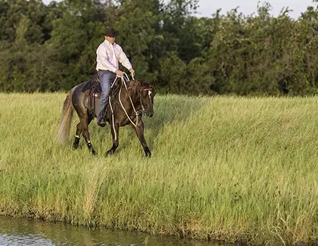 Be aware that some horses will try to run into large bodies of water. If your horse does that, don’t get dragged in behind him!