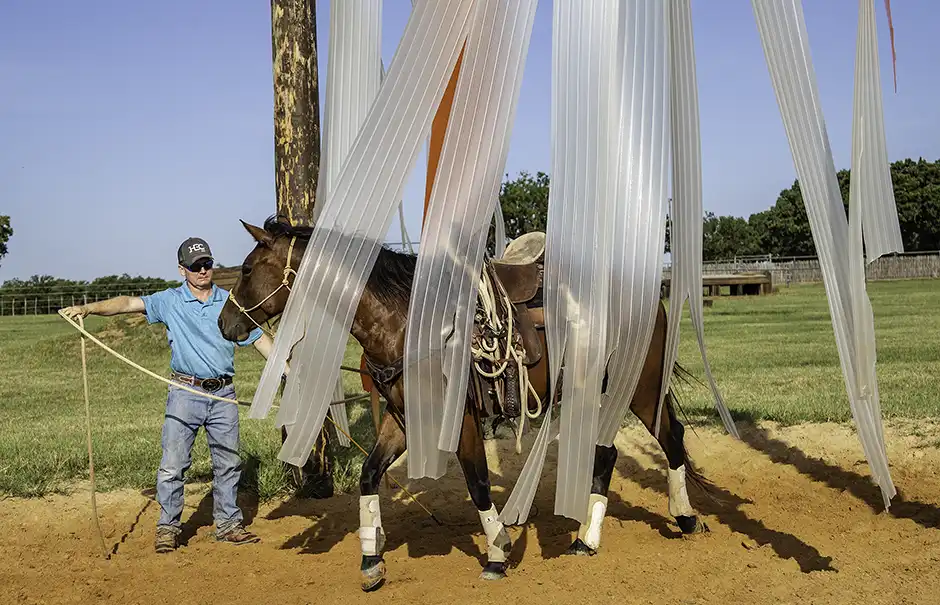 Because it moves and makes a noise, the Cowboy Curtain is one of the more advanced obstacles on the course and isn’t introduced to the horses until later in the training program. Larry works on building his horse’s confidence about pushing through the curtains.