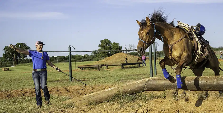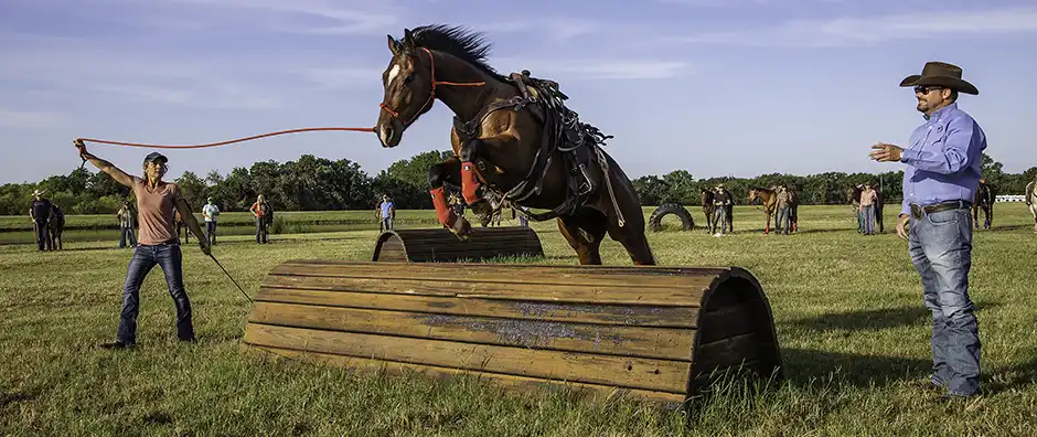 During the third week of the six-week Fundamentals training program, horses are introduced to the obstacle course. At this point in their training, the horses have been taught all of the Fundamentals level groundwork exercises and are ready to take their groundwork training to the next level. The obstacle course challenges the horses and exposes any holes they have in their training.