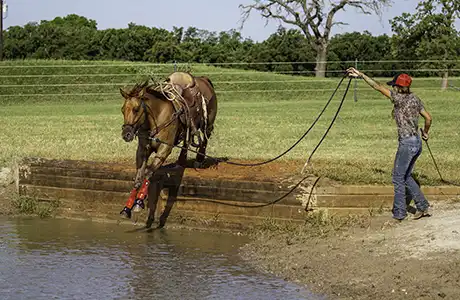 “Asking the horse to jump into water makes the obstacle scarier because you’re approaching it at a faster gait, and when he lands in the water, it splashes more and makes more noise. It’ll test your ability to keep momentum in the horse’s feet,” he added.