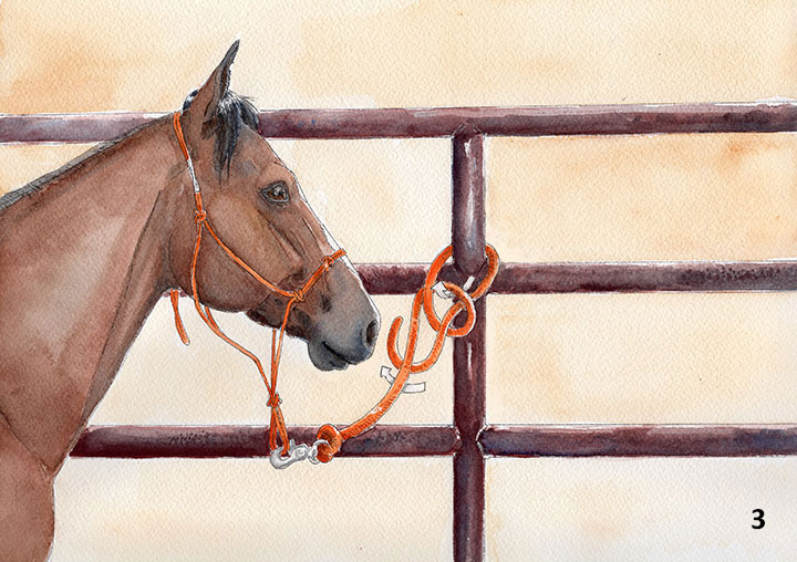 If you don’t have either of those tools at your disposal, you can tie your horse up using a Bowline knot. It’s my favorite knot because the horse can’t untie himself, yet if he does pull back, it’s relatively easy to undo the knot because it doesn’t tighten up on itself.