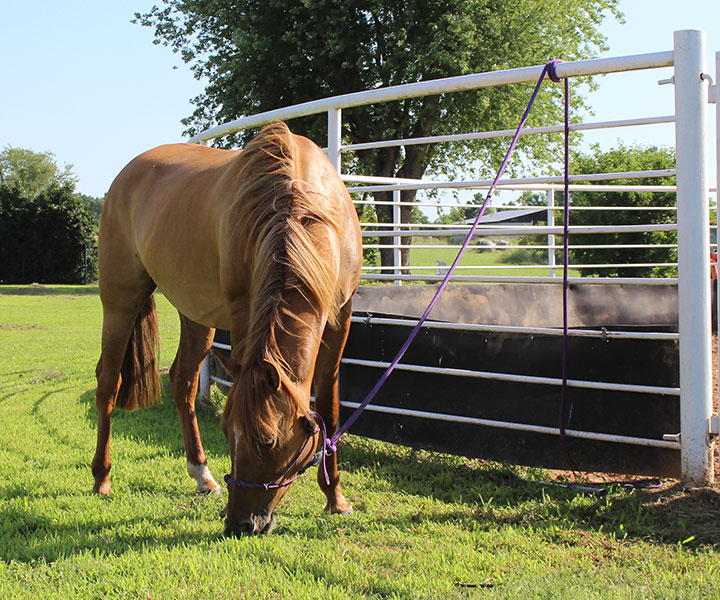 When a horse is tied correctly, he should be securely fastened to a safe, stable structure that won’t move if he does. The lead rope should be fastened so that there’s about a forearm’s length between the clip attached to the halter and where the lead rope is tied. It should be fastened at the horse’s eye level so that the tail of the rope is safely out of the horse’s way and he can stand comfortably.